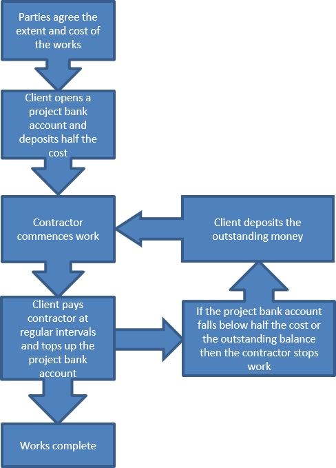 Within the account there are mechanisms to log disputes and request feedback and to change any previously agreed conditions or criteria. Registering for an account is free which allows you to utilise the contract and other features available. Once you are happy to move into a formal contract with a contractor you then activate your account at which time we set up your Project Bank Account. Each payment made to the Contractor carries and administration fee of £9.99 inclusive of VAT. The flowchart below demonstrates the process: